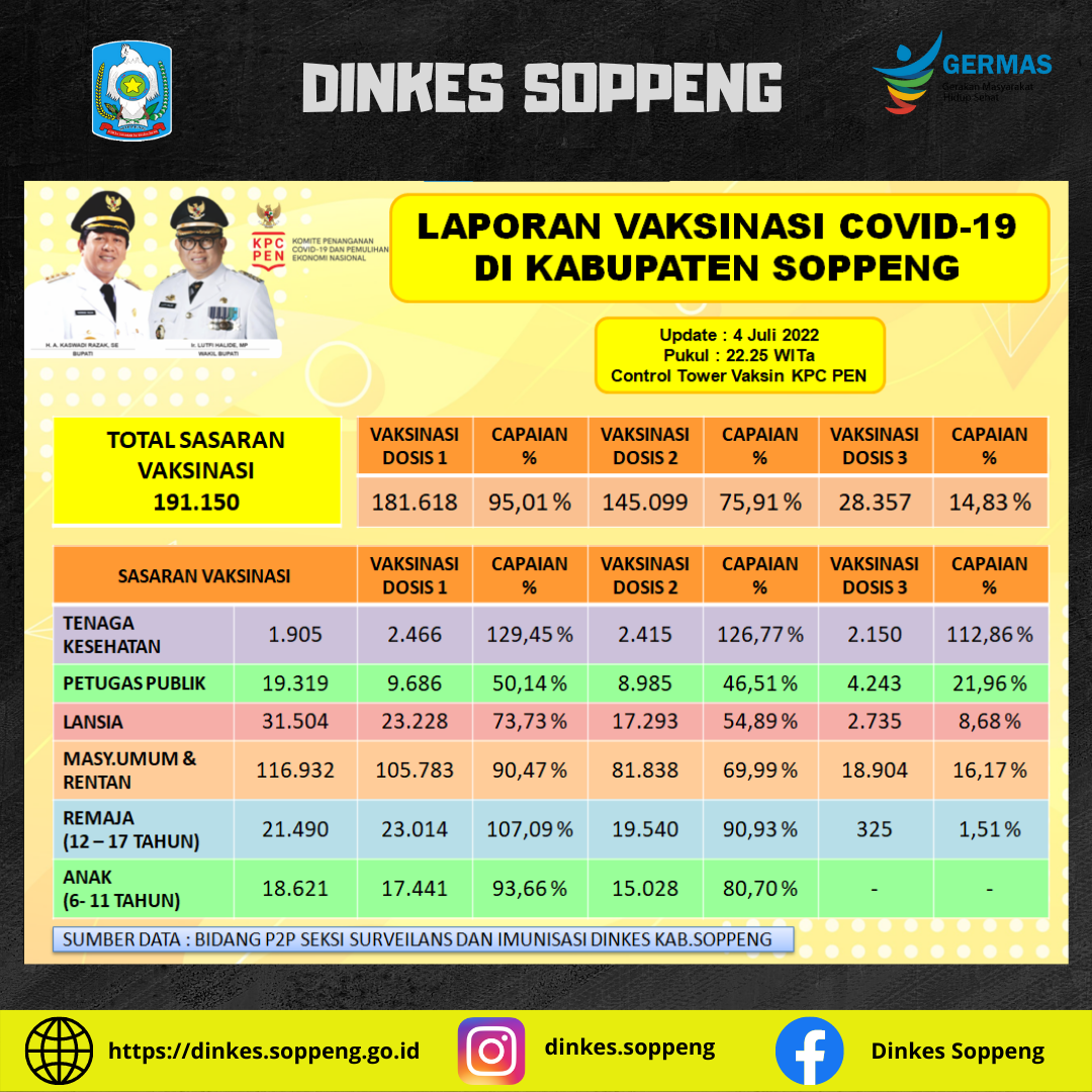 Update 04 Juli 2022 Vaksninasi Covid-19 di Kab. SoppengDinkes5 Juli 2022Tak Berkategori Sumber Data : Bidang P2P Seksi Surveilans dan Imunisasi Dinkes Soppeng Share Previous Pos Kontingen Kab. Soppeng di kegiatan Penilaian Tenaga Kesehatan Teladan Tingkat Provinsi Sul-Sel Tahun 2022. Next Pos Pembinaan Dalam Rangka Persiapan Penilaian Lapangan Nakes Teladan Tingkat Provinsi.