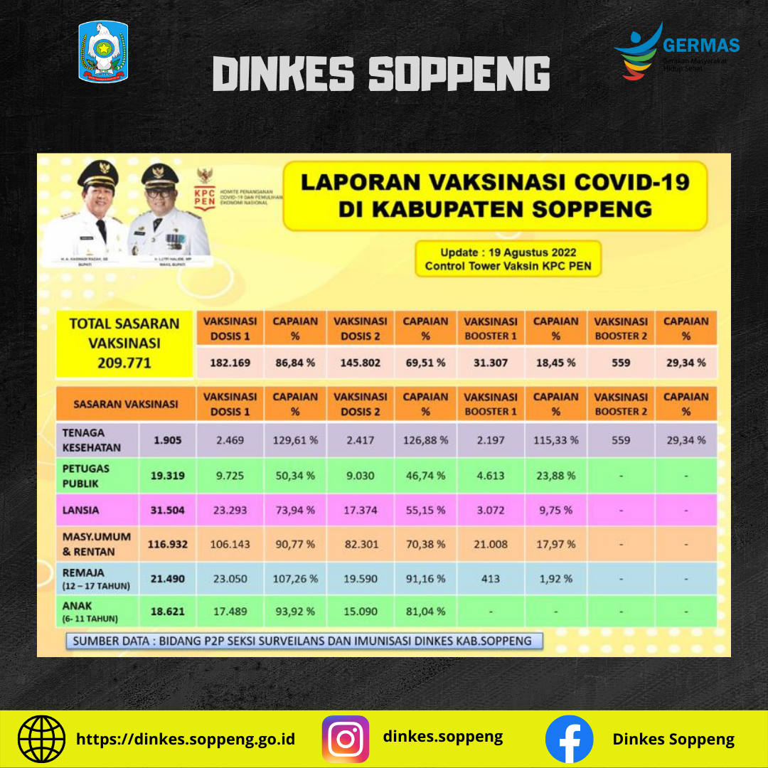 Update total vaksinasi di kabupaten soppeng tanggal 19 agustus 2022Dinkes22 Agustus 2022Tak Berkategori Share Previous Pos Bimbingan Teknis Kader Keamanan Pangan Dinas Kesehatan Kabupaten Soppeng Tahun 2022. Next Pos Mari Kita Cegah Frambusia melalui PHBS